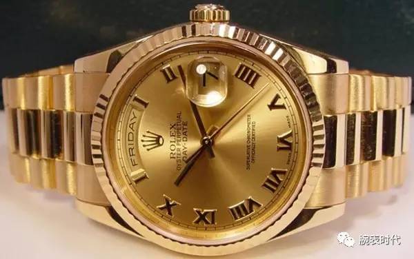 Rolex President 118238 腕表有黑色镶钻款,这一款表盘是香槟金色的。腕表搭配黄金表带售价$49,000。今天男士戴这款表可能会显得比较俗气,因为它是80年代流行的那种表。