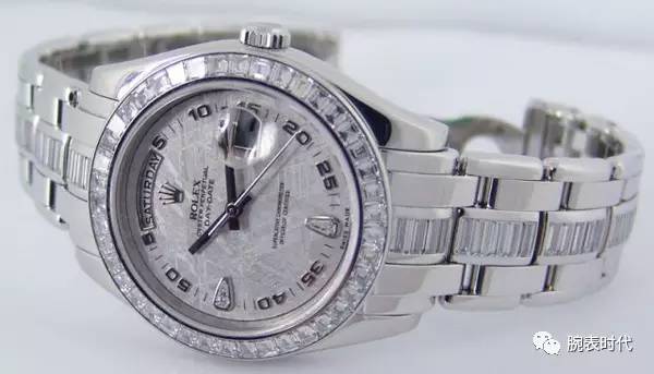 这款劳力士于2011年推出,是同系列中的Special Editon,采用铂金材质打造表壳及表链,并以长形钻石镶嵌在手表外圈及表链中间。关键是,盘面由陨石打造。它是劳力士制造的最贵的手表。