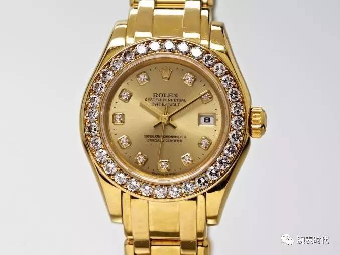 劳力士Rolex Pearlmaster 80298女士腕表整体使用18K黄金材质,表圈一周更是镶嵌满了一圈巨大的钻石,闪耀非常。纯净的香槟色表盘上更是以包金边的方钻作为时标,在黄金的映衬下整体显得非常奢华。女人天生喜欢钻石,劳力士深谙此理,直到今天它的女表还少不了钻石。